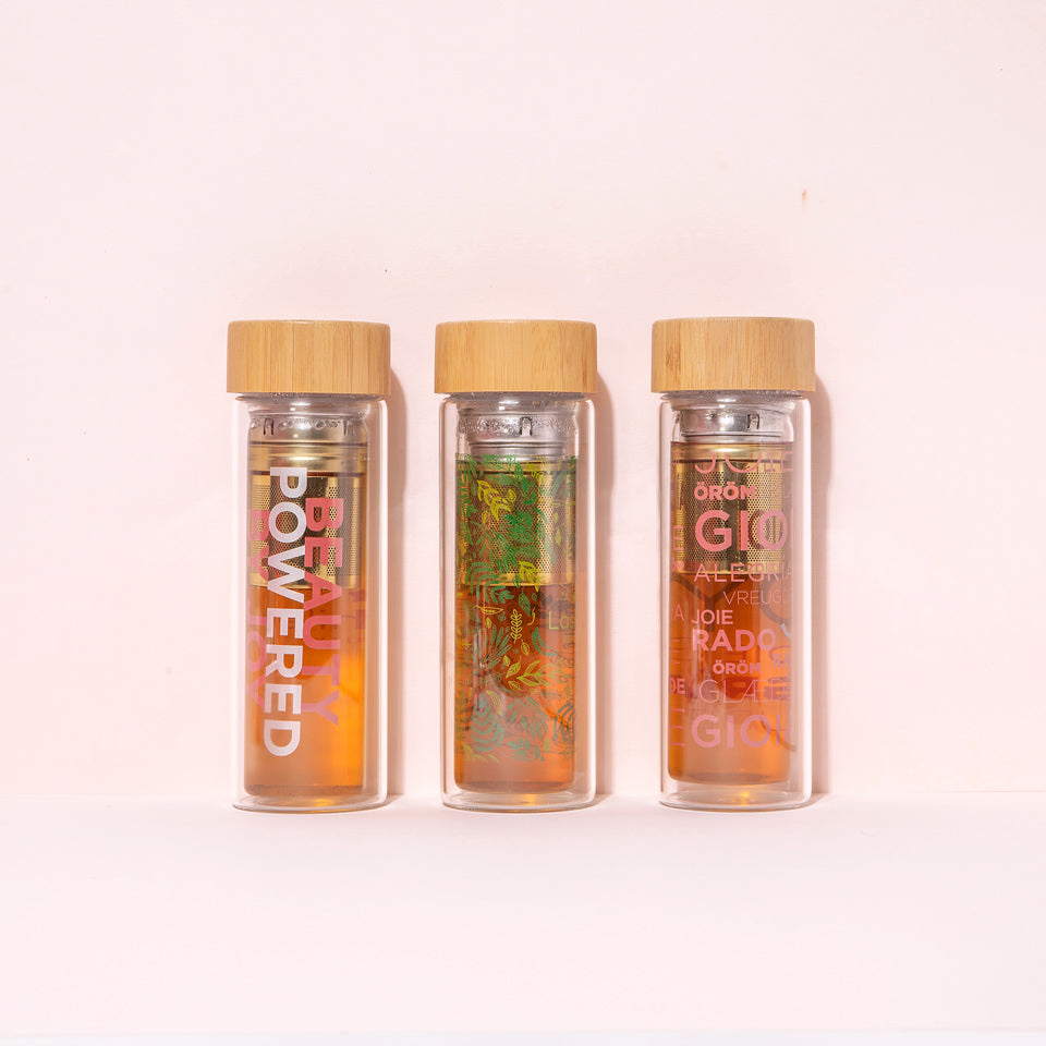 Composition: borrosilicate glass, bamboo cap, stainless steel filter.